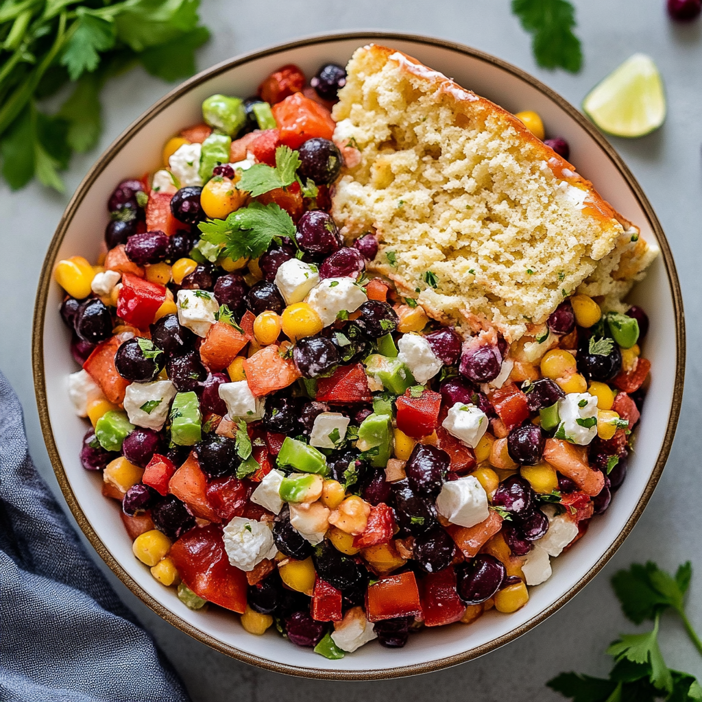 Cowboy caviar is a vibrant, flavorful salad that originated in the southern United States. It typically combines black-eyed peas, black beans, corn, tomatoes, bell peppers, onions, and a zesty dressing made from lime juice and olive oil. Often served as a dip with tortilla chips or as a side dish, this dish is not only delicious but also packed with protein and fiber. The colorful ingredients make it visually appealing, perfect for gatherings or potlucks.