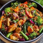 Next-Level Teriyaki Chicken Stir-Fry with Rainbow Veggies & Wild Rice is a vibrant and flavorful dish that brings together tender chicken, colorful vegetables, and a savory-sweet teriyaki sauce. Quick to prepare, this stir-fry is perfect for busy weeknights or impressing dinner guests. Enjoy it served over nutty wild rice for a satisfying meal that’s both nutritious and delicious.