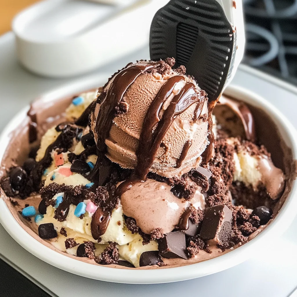 First, mix the chocolate ice cream base while preparing the toppings. Once the base is ready, layer in your favorite ingredients like marshmallows and nuts. Freeze until firm for optimal consistency.