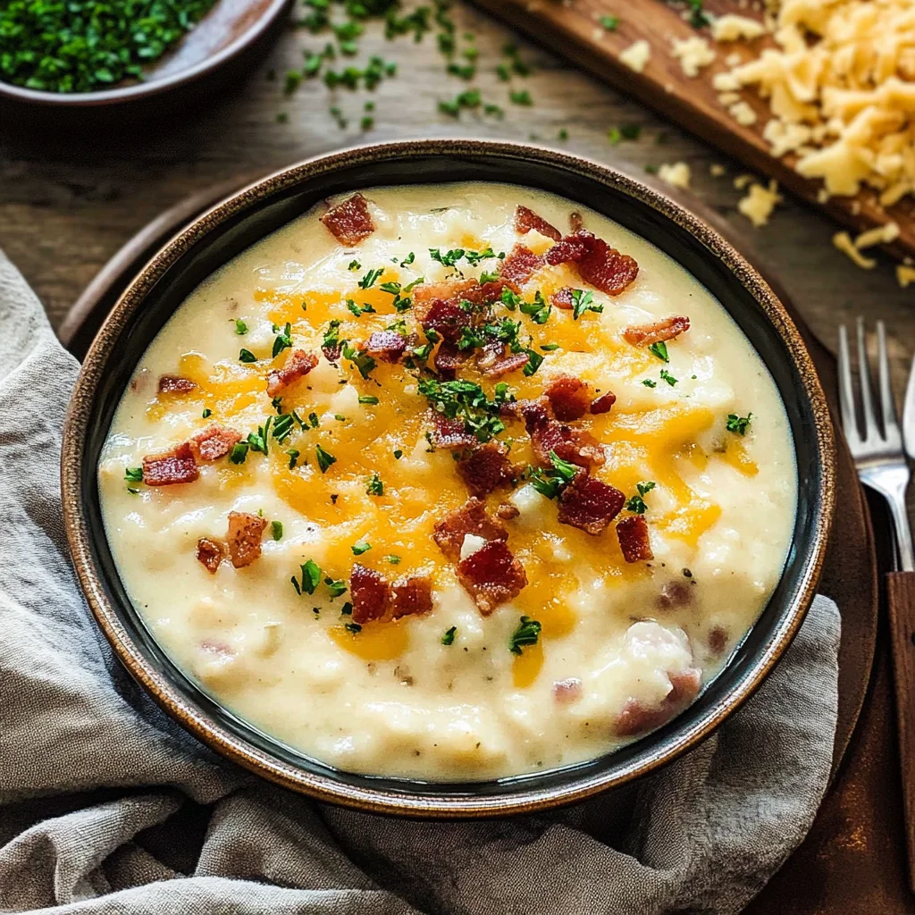 Start by baking the potatoes until they’re tender. While they cool, cook the bacon until crispy. Then, sauté onions and garlic in the bacon fat for an aromatic base. Combine everything in a pot with broth and cream, simmering until perfectly blended.