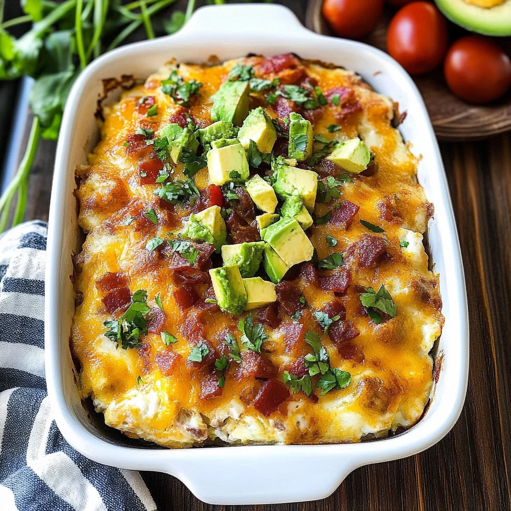 There are many delicious variations you can try with your avocado breakfast casserole! Swap out avocados for sweet potatoes or zucchini if you’re looking for something different. You could use different types of cheese like feta or goat cheese instead of cheddar. For an extra protein boost, consider adding cooked quinoa or beans. If you enjoy spicy food, adding jalapeños can give it a nice kick! The possibilities are endless and fun to explore.