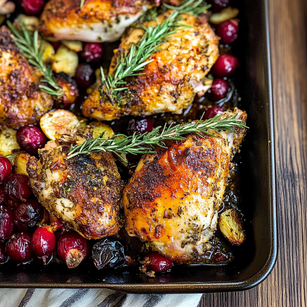 Start by preheating your oven while you season the chicken. Sear the chicken skin-side down in a hot pan for crispy texture, then transfer it to the sheet pan alongside cranberries, vegetables, and spices. Roast until everything is perfectly cooked and fragrant.