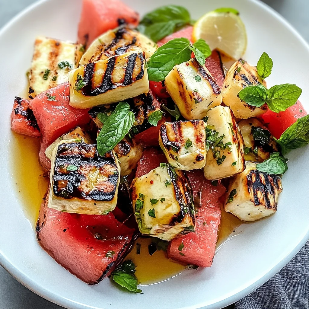 Grilled Halloumi Watermelon Salad is a refreshing summer dish that beautifully marries the savory flavor of grilled halloumi with the sweet, juicy texture of ripe watermelon. Enhanced with zesty lime and aromatic fresh mint, this vibrant salad is perfect for picnics, barbecues, or as a light meal. Simple to prepare yet impressive enough to wow your guests, it’s a delightful way to celebrate warm weather.