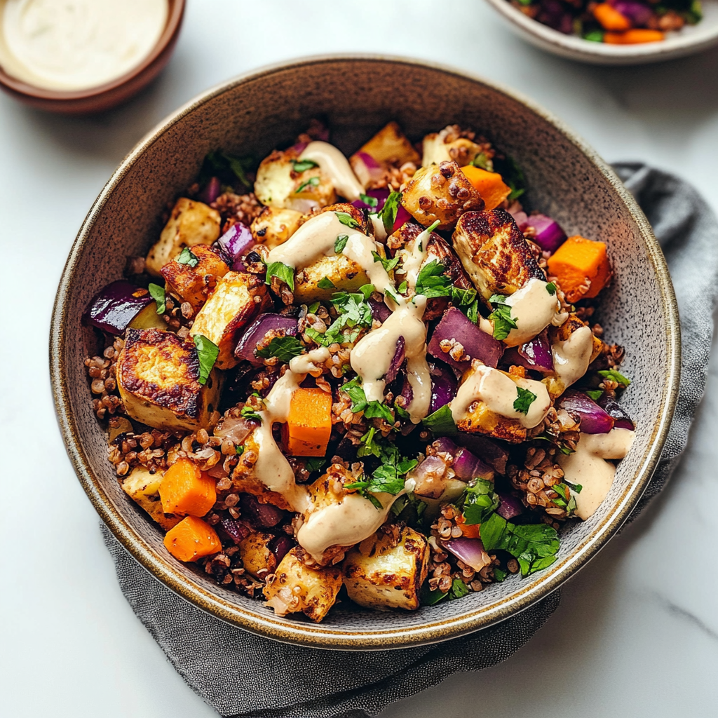 The aroma of roasted vegetables fills the air, enticing your senses with its earthy, sweet notes. Picture a tray of vibrant, shaved root vegetables nestled alongside golden-brown herb-crusted tofu, each ingredient harmonizing to create a culinary masterpiece that’s as visually stunning as it is delicious.