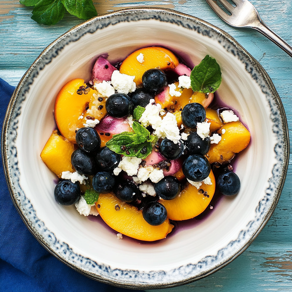 Start by preparing your ingredients—wash those blueberries and peaches, crumble your feta, and toss everything into a bowl. Drizzle with olive oil and balsamic vinegar, then give it a gentle toss. Serve immediately for the freshest taste!
