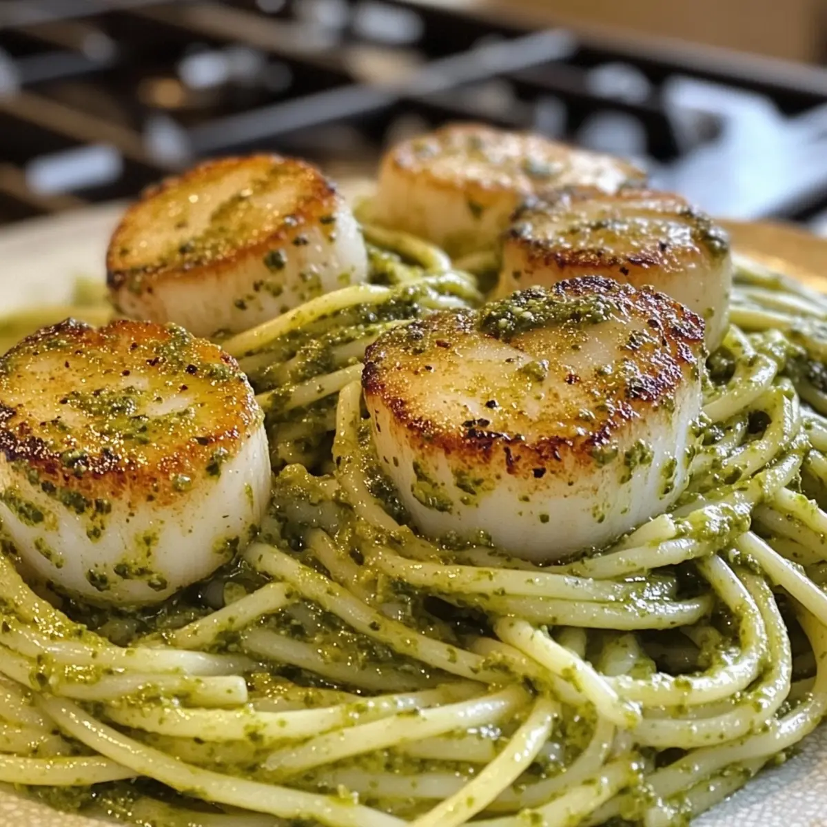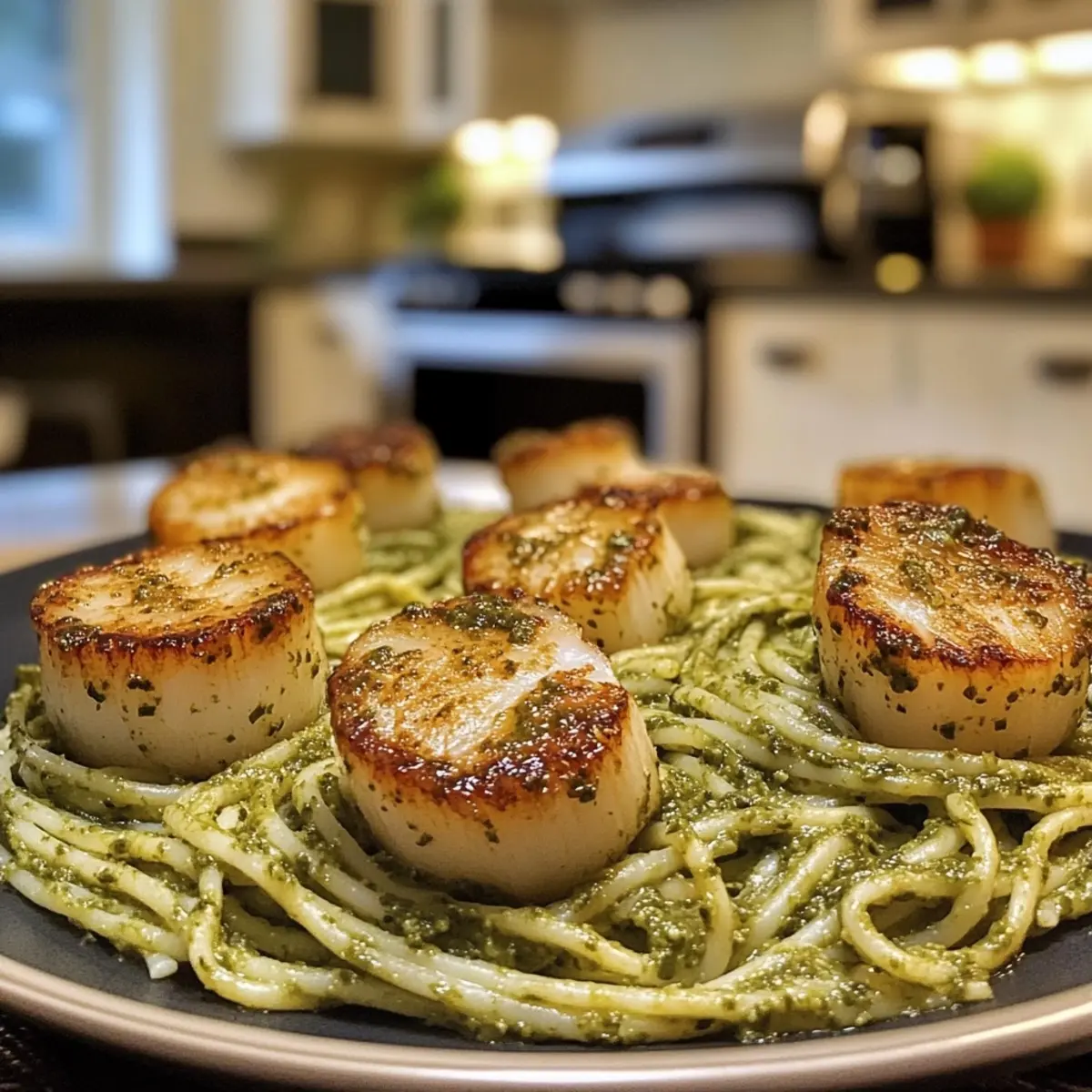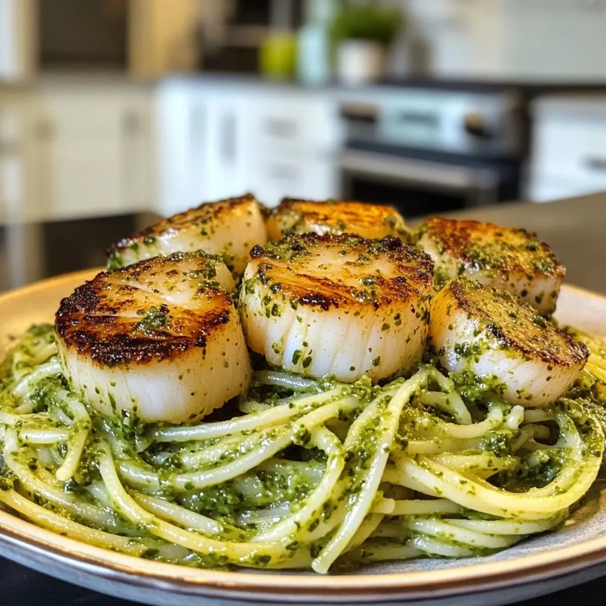 Luxurious indulgence: This dish showcases the elegant flavor of seared scallops paired with vibrant pesto, creating a gourmet experience right in your kitchen.
