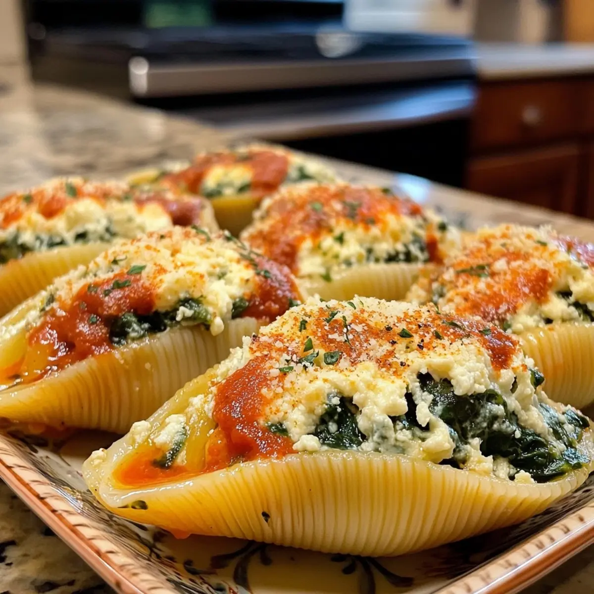 - Assemble: Preheat your oven to 375°F (190°C). Spread a layer of marinara sauce in a baking dish. Fill each pasta shell with the spinach mixture, place them seam side up, and top with additional sauce and mozzarella.