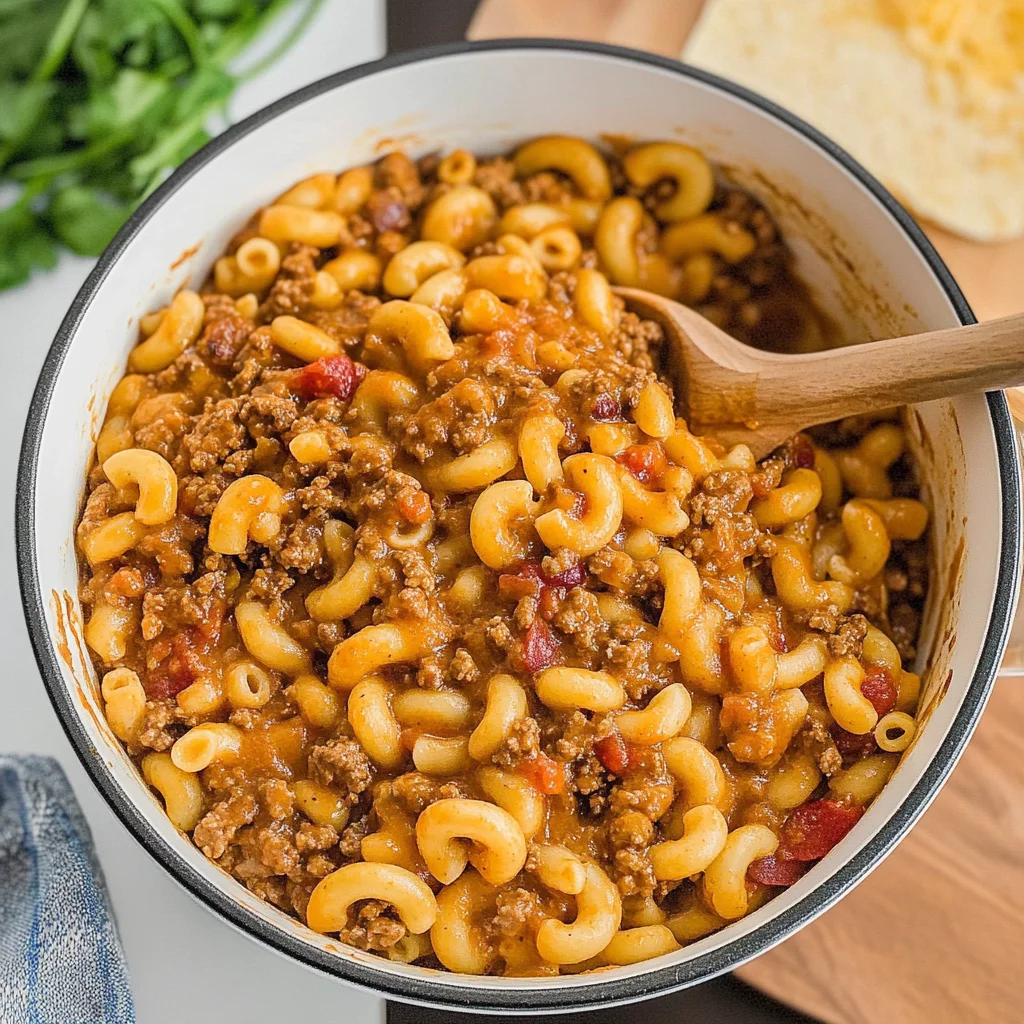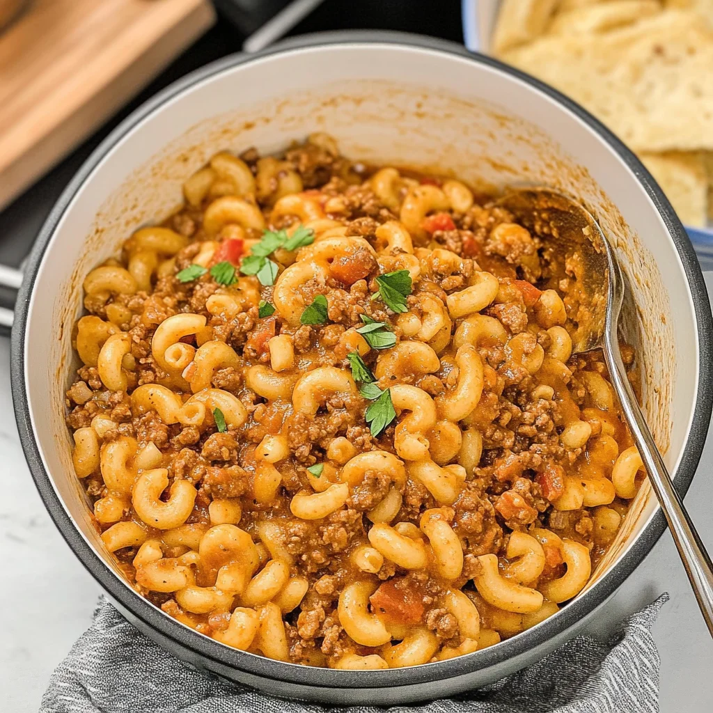 Start by browning the ground beef in a large pot, then toss in your onions and garlic until fragrant. While that simmers, boil your macaroni separately to achieve the perfect al dente texture before mixing everything together.